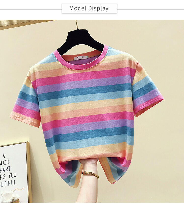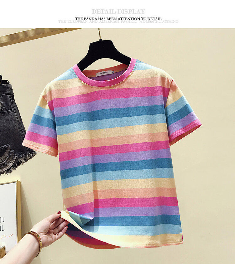 Super Popular Striped Korean Style Loose Round Neck Ins Short Sleeve T-shirt